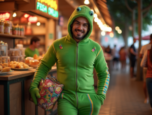 Ein bisschen Nostalgie gefällig Dieses Kostüm ist der absolute Hit dieses Jahr – und nicht nur für Kinder Stell dir vor ein plüschiger grüner Körper mit bunten Streifen und einer auffällig ausgeprägten Hinterseite. Perfekt für alle, die sich am Buffet hemmungslos durchfressen wollen. Ein extra Highlight Bring kleine Snack-Tütchen mit und verteil sie als Futter – der Lacher ist garantiert.